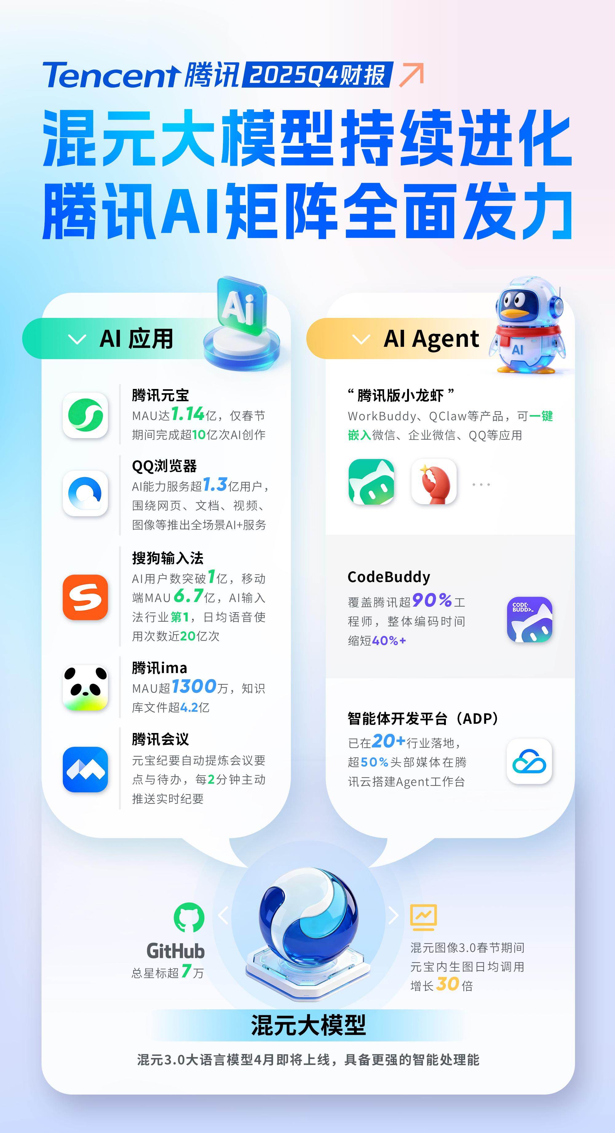 除混元3.0将于4月发布外,WorkBuddy、QClaw等“小龙虾”系列Agent陆续上线,元宝、ima、QQ浏览器、搜狗输入法等AI应用的用户活跃度不断提升。