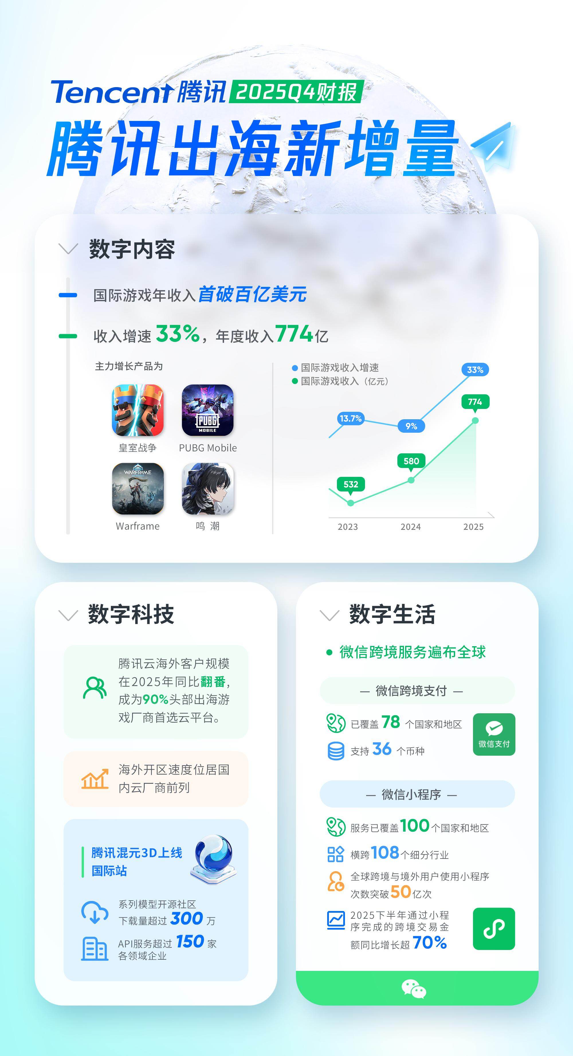 2025年,腾讯国际业务继续扩展,游戏、云服务与微信生态三条业务线同步发力,海外收入规模持续扩大,为公司增长打开新的空间。