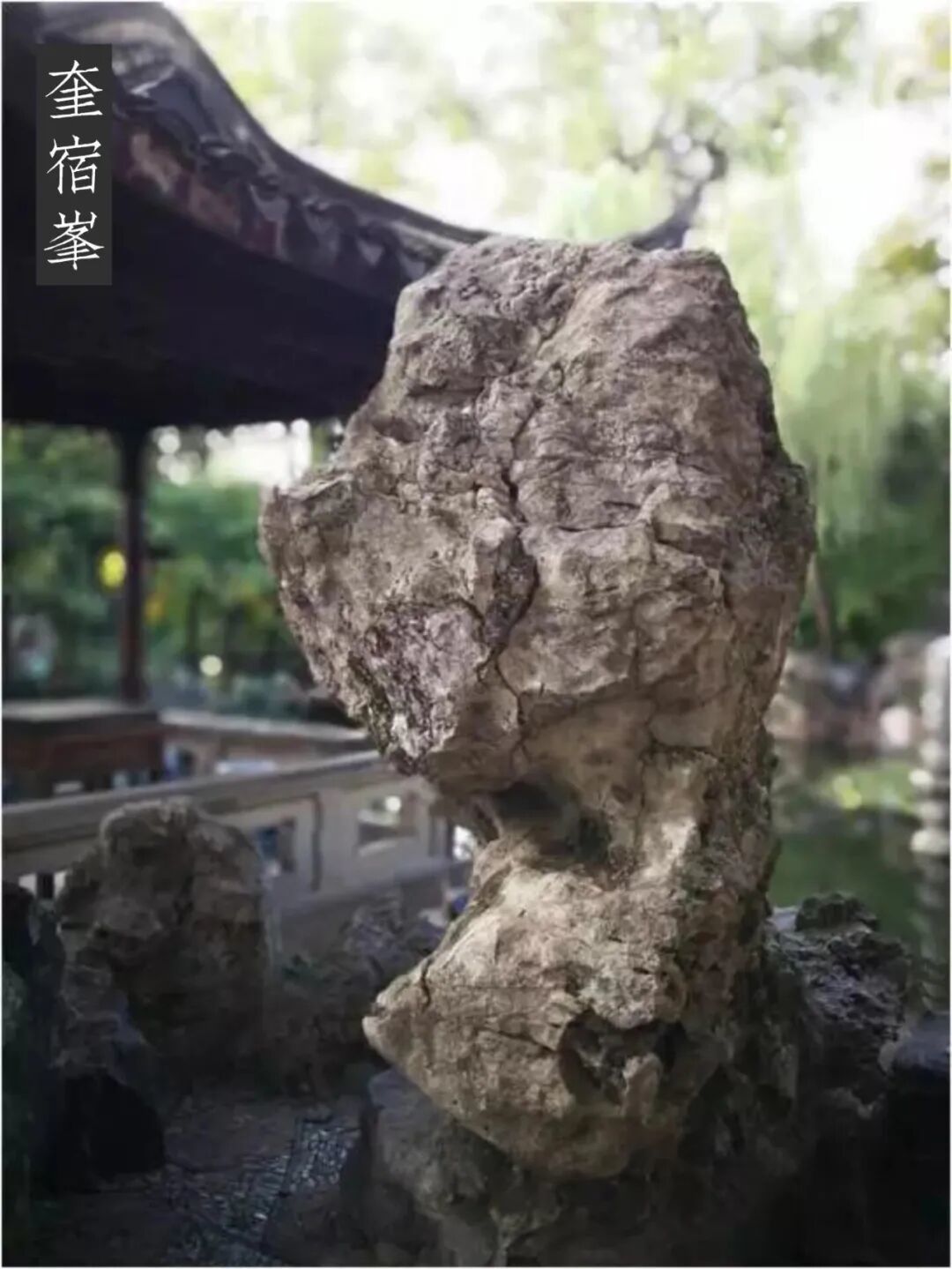 奎宿峰 在曲溪楼前、濠濮亭旁河滩踏步左边,临池而立,高2.2米。粗看貌不惊人,但从楼门前望去,峰的形状与天上二十八星宿中的奎宿星极为相似,称之奎宿,可谓妙极。《石氏星经》说:“奎十六量,形如破鞋底,在紫微垣后传舍下。《春秋合城图》说:“奎立武库。”《孝经援种契》说:“奎主文昌。”刘恕在十二峰图题诗曰:“崔巍形势俨堂堂,偶尔题名拟戴筐。覆以槐阴勤手植,儿曹须记此花黄。潘奕隽有诗曰:“书堂异石应星文,冠顶飞来缥缈云;要与传经志奇瑞,奎光夜夜映香芸。”今曲溪楼下已作为游人过道,但刘恕时却为书堂,名攸宁,从今曲溪楼及西楼墙壁上条石中刘恕所书题跋可知。诗中“书堂异石应星文”句,更言明了此石的位置和形象,点明了此石置于书堂前的良苦用心。前有亭名掬月,有月在池,少不得需要星星作伴。