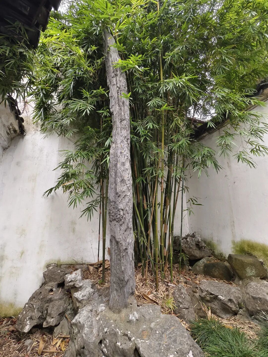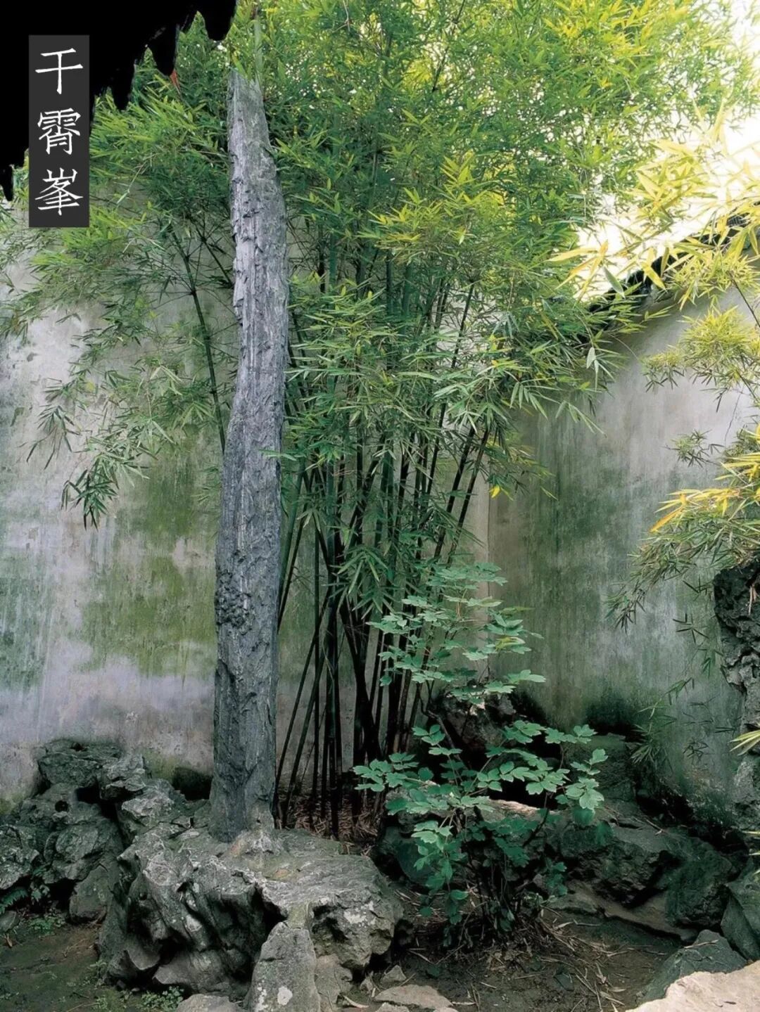 干霄峰 1975年12月,陈从周先生在留园土山上发现了一方隶书石刻残碑,14字一行,计有16行。内容主要叙述干霄一峰的来历。文曰:“居之西偏有旧园,增高为冈,穿深为池,溪径略具,未尽峰峦层折之妙,予因而葺之。拮据五年,粗有就绪,以其中多植白皮松,故名寒碧庄。罗致太湖石颇多,皆无甚奇,乃于虎皇之阴沙碛中,获见一石笋,广不满二尺,长几二丈,询之土人,俗呼为斧劈。石盖川产也不知何人辇至,卧于此间,亦不知历几何年。予以百斛艘载归,峙于寒碧庄听雨楼之西,自下而窥,有于霄之势,因以名焉……。”潘奕隽诗曰:“夏天浓翠落衣凉,未觉捎云竹影长;闻说桐衫甘露满,共侍一品属元章。”刘恕自题诗曰:“耿耿青天插剑门,云镂月有陈根;孤庭独立三千丈,万笏吴山一气吞。”