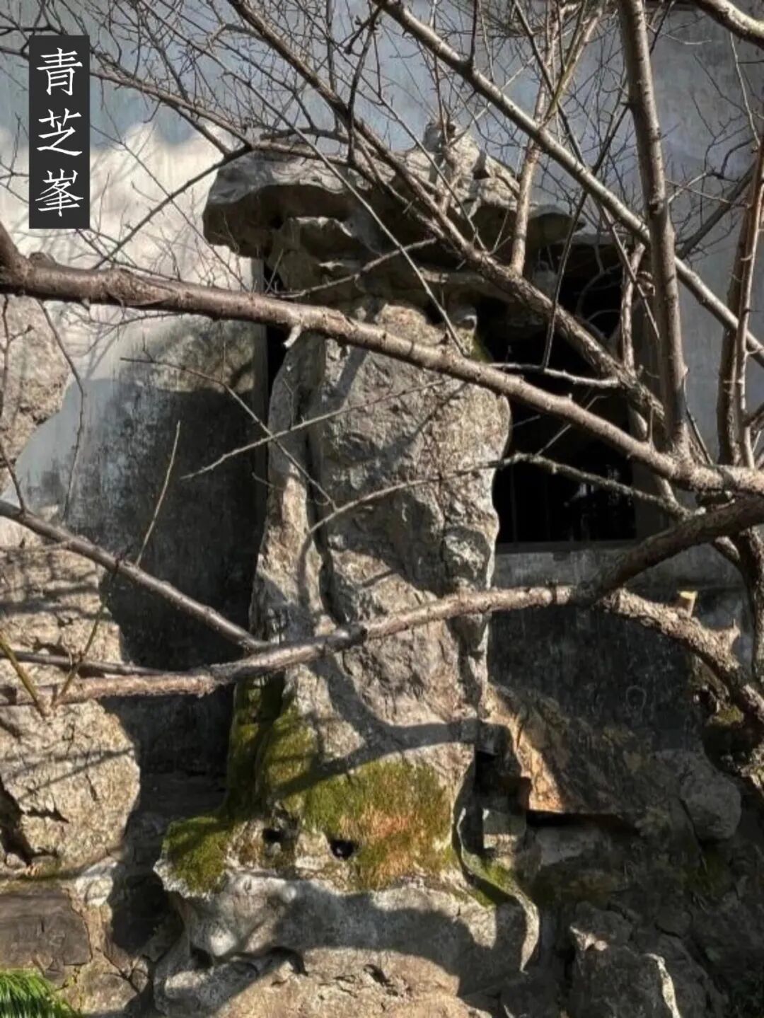 青芝峰 在西楼之西,高2米余,当窗而立。王学浩在十二峰图中题诗曰:“瑶岛蓬壶几处径,一株移植常青青;呼童饱噉胡麻饭,好向松根刨茯苓。”潘奕隽有诗曰:“可是东园甪里遗,肉芝何似石芝奇;仙家服食能知否,试问兰陵萧静之。”刘恕在上文中提到“亭前向有二石”,而潘诗谓“可是东园甪里遗”,真是不期而合,点明了此石乃为园中旧物。其峰顶现有的一块横放湖石,但盛氏家照上是没有的,说明在民国初年还没有这横加之石,估计是后来修复时,为符合园内所谓的“狮”“虎”、“豹”、“象”中的豹石,才添加上去的。