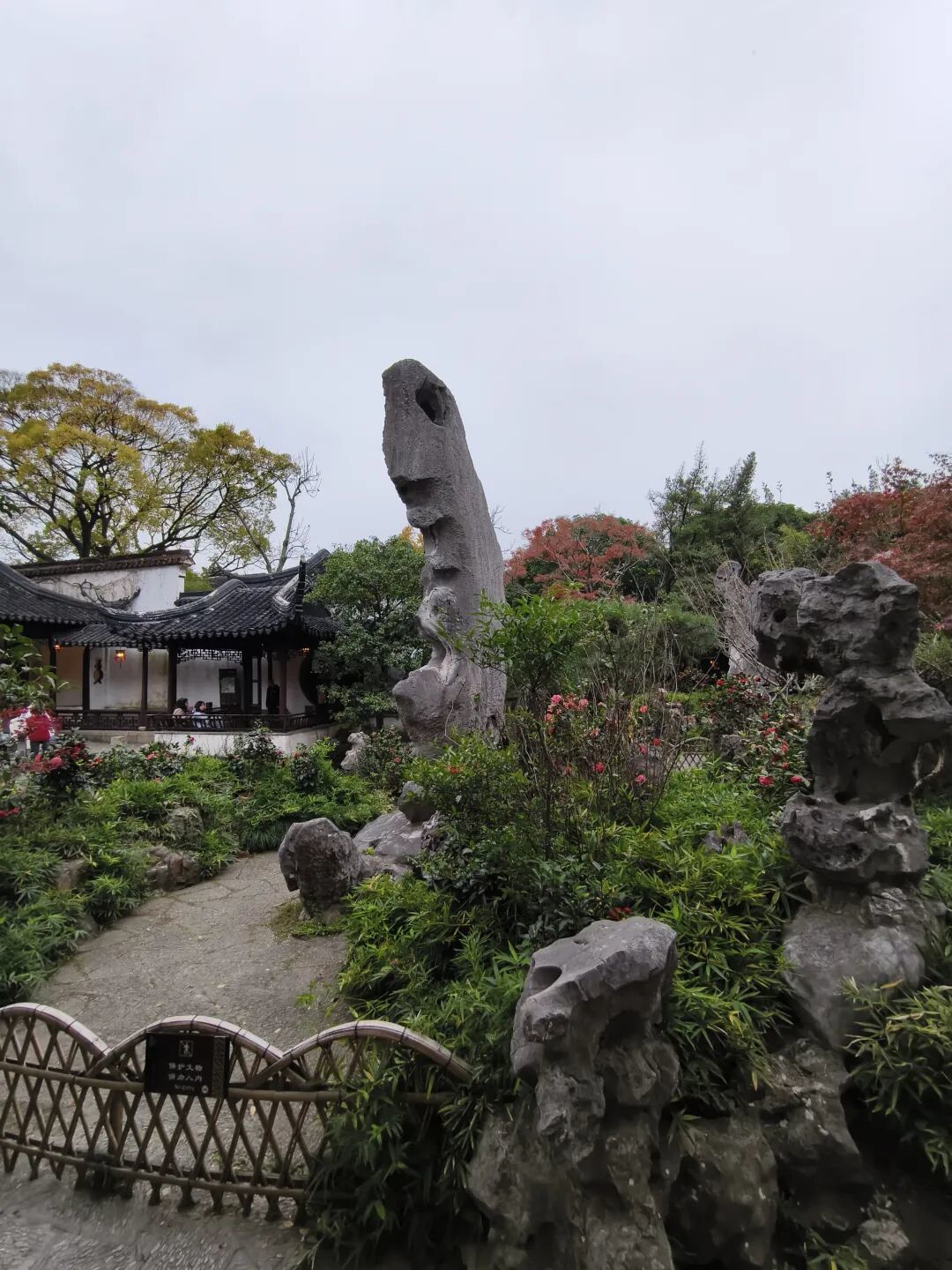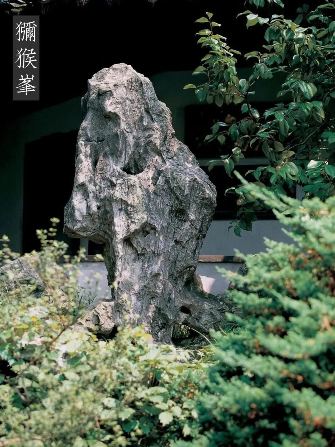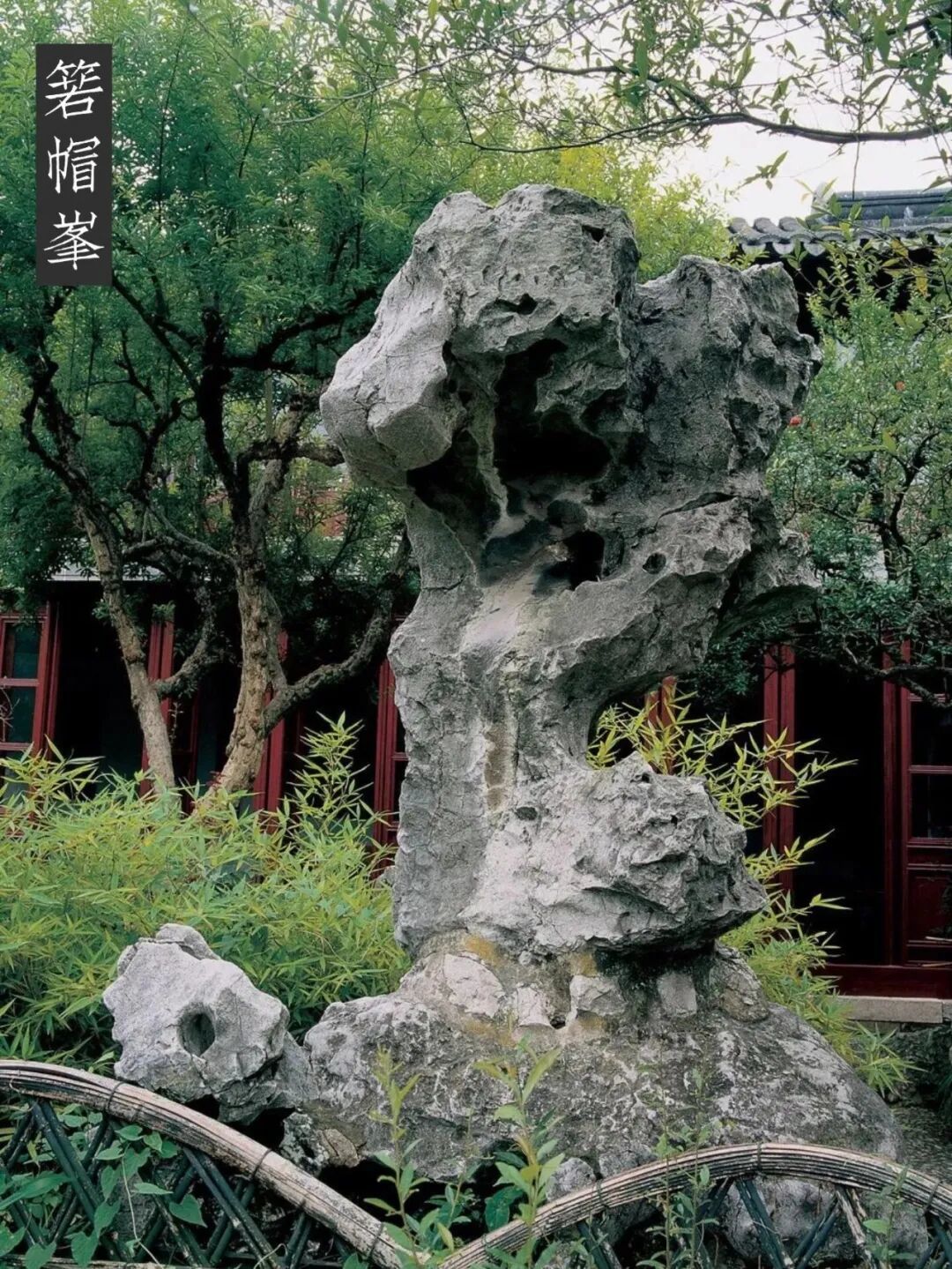 箬帽峰 在冠云峰下东侧,高约2.5米。形如一朵蘑菇云,又似一个瘦小的老头,伛偻着背,头戴一顶大箬帽。石背镌有“蒻帽峰”“蓉峰题”6字。笔者在1984年去看时,其字还能辨认,后因此峰原有折裂处,经重新加固,本来只有两只铁搭,换上了3只新的铁搭,箬帽峰3字便荡然无存;旁边的“蓉峰题”3个小字,如今也只能看清一个“峰’字,“蓉”字已难辨识,“题”字只剩下半个了。瞿应谦题诗曰:“俨然戴笠翁,忘言对幽境;忽闻池面声,游鱼逊其影。刘恕自题诗曰:“伛偻江头一钓翁,斜欹箬帽半遮风;却将无限金貂意,付与蝉声中。”潘奕隽有诗曰:“从来强项惊凡眼,不必低头效苦吟;识得丈人心是石,肯将箬笠换华簪。”诗中“斜欹箬帽半遮风”、“不必低头效苦吟”之句,将峰貌描绘得惟妙惟肖。如今瘦小的“箬帽”,紧挨着高大挺拔的冠云峰,真如清代朱霆清题“林泉耆硕之馆”联语“奇峰特立,依旧千霄直上,旁罗拳石似儿孙”的味道。按理说,此石原非立于此地,今其地原在刘恕“寒碧庄”之外,光绪十四年至十七年时为盛康添辟,称之为“东园”。此石可能在解放初整修留园时,拆除了原园中“少风波处便是家”(今又一村东竹林的位置)等残余建筑后,移立于此。