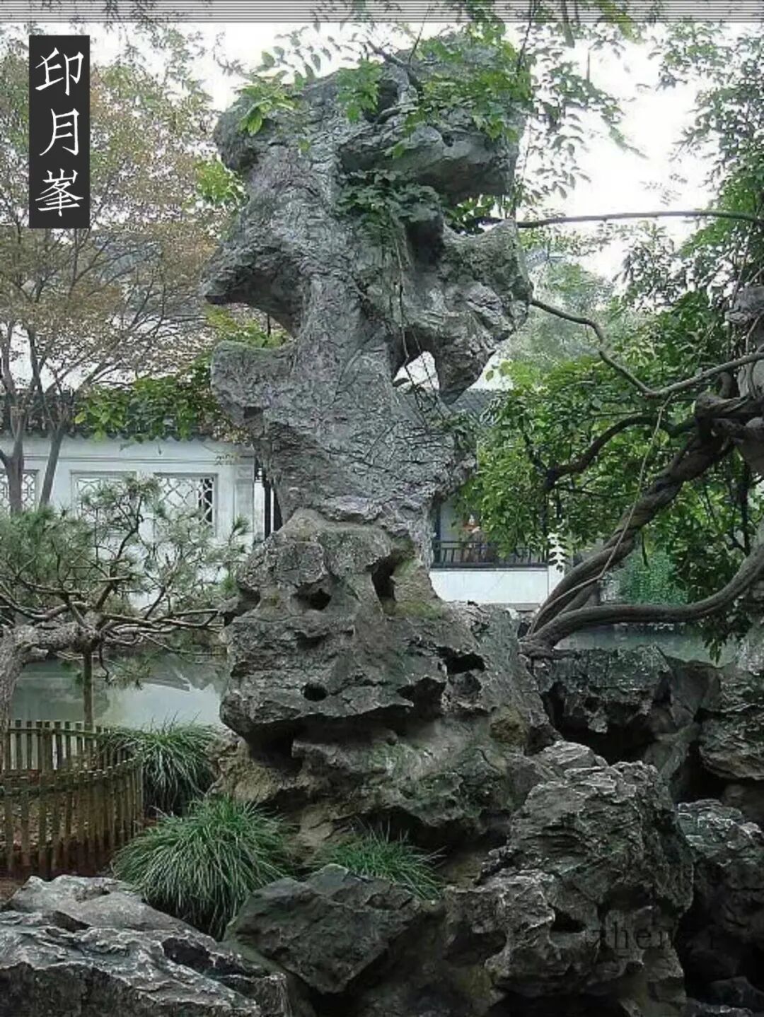 印月峰 面西临池,高约2.2米,正面小而背面大,整块峰石呈圆方形,盘拗秀出,如灵丘飞云。石峰中部有一个天然涡孔,倒影落在水中,印出一轮明月,似垂手可掬。吴县潘奕隽诗曰:“我欲乘风到广寒,琼楼矫首路漫漫。何当秋月如珪夜,来看瑶峰上玉盘。”池边小亭亦因峰石而取名掬月,其旁又砌有河滩踏步,似备捞月之用。刘恕借石生景,无论白日黑夜,阴晴雨雪,均能以此石倒影形成的月亮娱目遣兴,可谓巧于因借了。