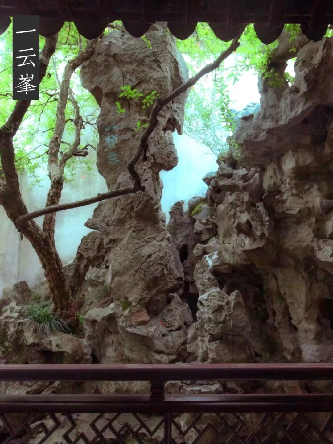 一云峰 在明瑟楼南,正面镌有“一梯云”三字,和冠云、瑞云、岫云3峰正面刺字一样,当为盛氏所题。峰高4.2米,如云似帆,屹立于假山石径之旁,掩去山道大半,使人不觉峰后有山径小道,颇有峰回路转之妙。峰东南侧,隐约可见“一云峰”三字。潘奕隽诗曰:“一云山下卸春帆,岚翠湖光记满衫;道是此峰才半角,却疑径转到灵岩。”又写有《寒碧庄杂咏·为刘蓉峰--卷石山房(注:今涵碧山房)诗》。可见“卷石”二字,广义是指今厅堂周围假山,狭义则是指今明瑟楼边假山,仅“灵岩一卷”而已。特别是诗中“疑有旧题名,剜坐怀古”两句,说明了卷石山房及其旁的明瑟楼和假山石峰均为旧物。由此推测,一云峰当为徐氏东园旧物。