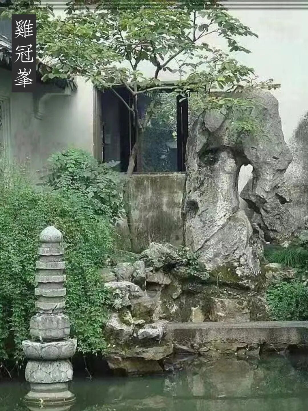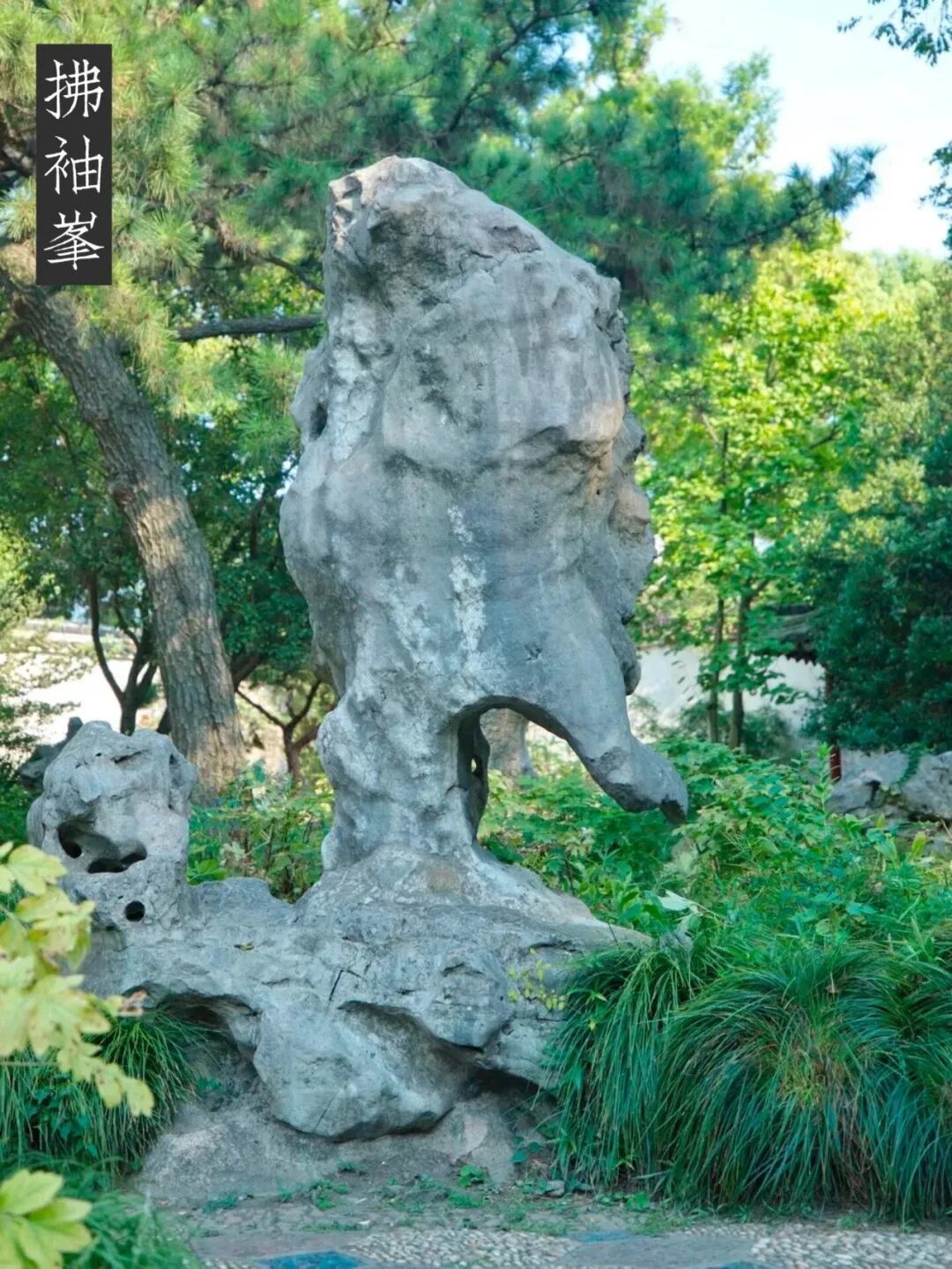 鸡冠峰 在今濠濮亭北、西楼之西、石桥北边,高约2.5 米。峰上端形如鸡冠,或许其冠过于肥大,一头垂下似象鼻,故又有“象石”之称。潘奕隽诗曰:“纵不能言未可烹此生久矣倦飞鸣;只应唤取窠中叟,同听潇潇风雨声。”孙铨诗曰:“岂学鹬冠者,但诩知天文;雄心具石骨,鸣将人不闻。”从其鸡冠上凿有的四只榫眼和凹槽来看,其石曾作过其他叠山之用。