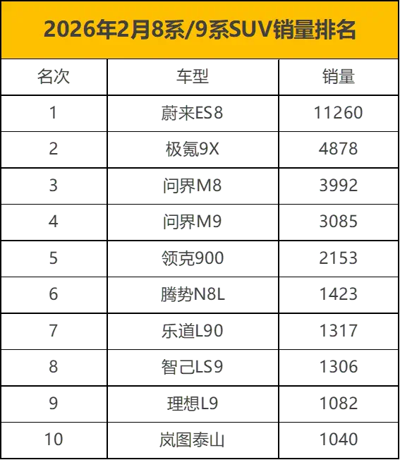 问界M8和M9位列第三和第四,分别卖了3992辆和3085辆,名次算是正常发挥,因为2月份有春节假期的因素,所以销量数据相比往月有一定降幅。领克900排名第五,卖了2153辆,它的定价在一众9系SUV中算是比较便宜的,买的人也挺多。