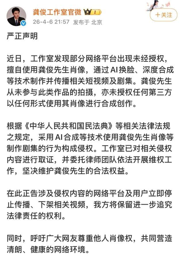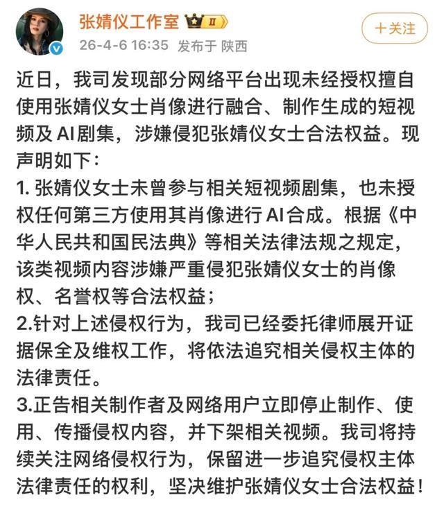 4月6日,张婧仪、邓为、龚俊工作室接连发布抵制AI短剧侵权声明,称部分网络平台未经授权擅自使用其肖像,制作和传播AI剧集按月配资,要求停止侵权并下架相关视频。