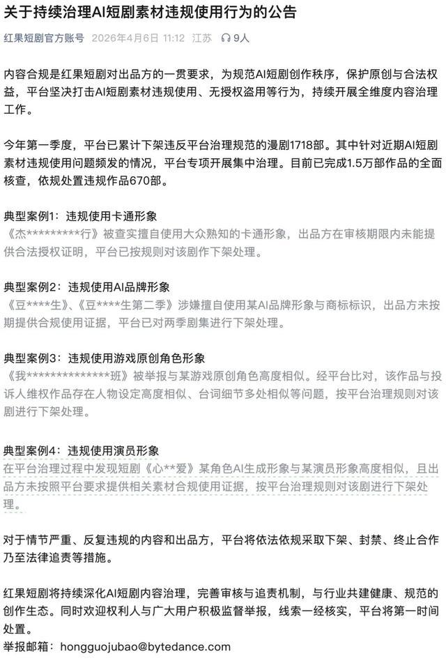 数据显示,今年第一季度,红果短剧平台已累计下架违规漫剧1718部。其中针对近期AI短剧素材违规使用问题频发的情况,平台专项开展集中治理,目前已完成1.5万部作品的全面核查,依规处置违规作品670部。对于情节严重、反复违规的内容和出品方,红果短剧表示,将依法依规采取下架、封禁、终止合作乃至法律追责等措施。